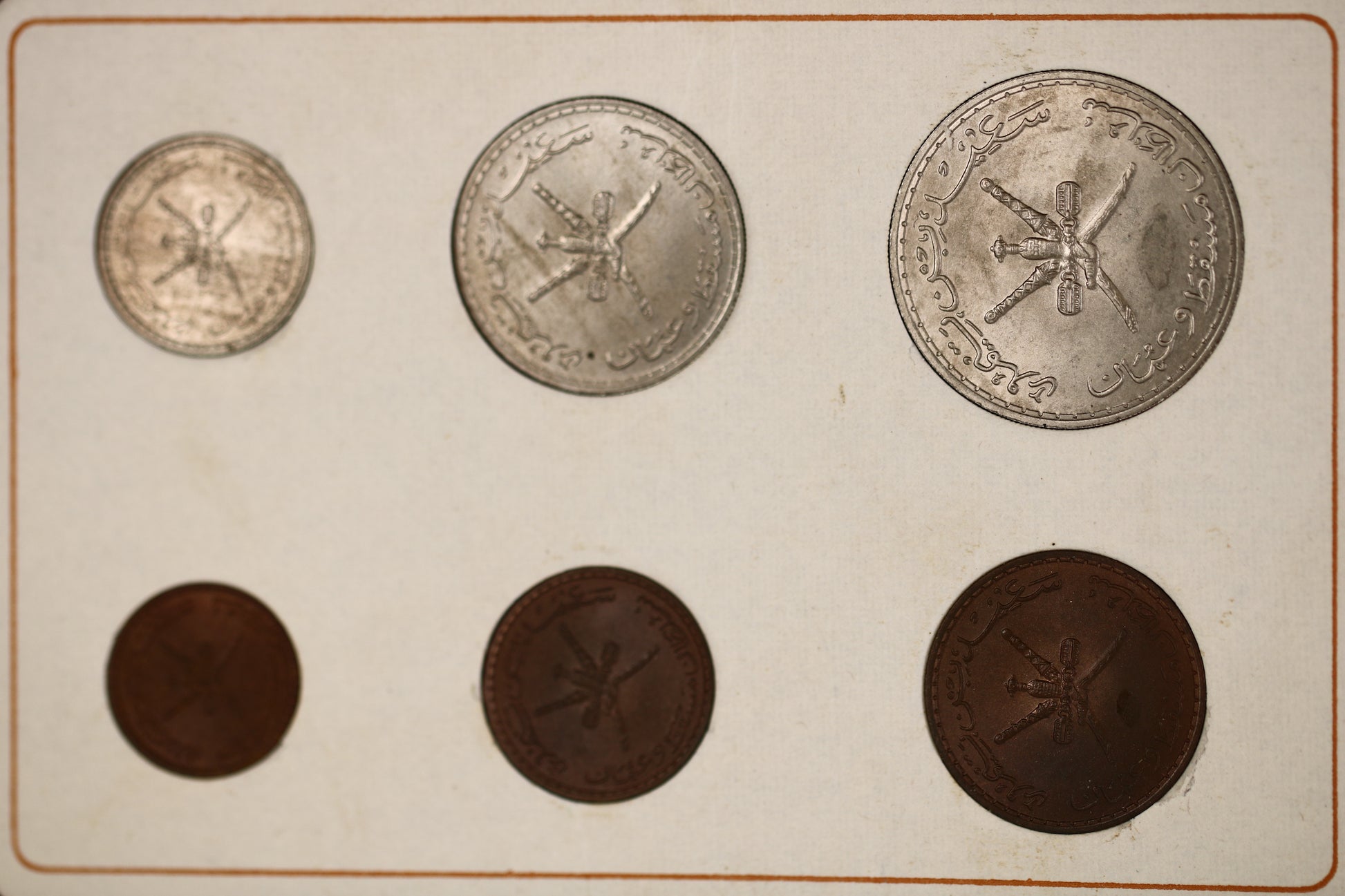 A collection of Omani coins, specifically a set likely from the Sultanate of Muscat and Oman era, dating around the 1970s. These coins were part of the initial coinage introduced after the establishment of the modern Omani currency system.