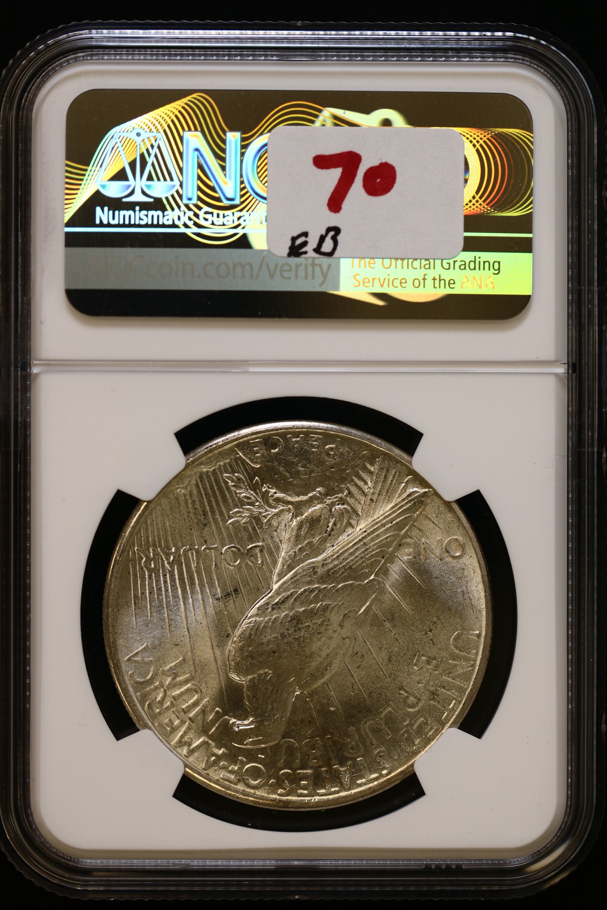 Reverse: Eagle standing right on rock, wings folded, seen from the back, branch in talons, rays behind, PEACE below